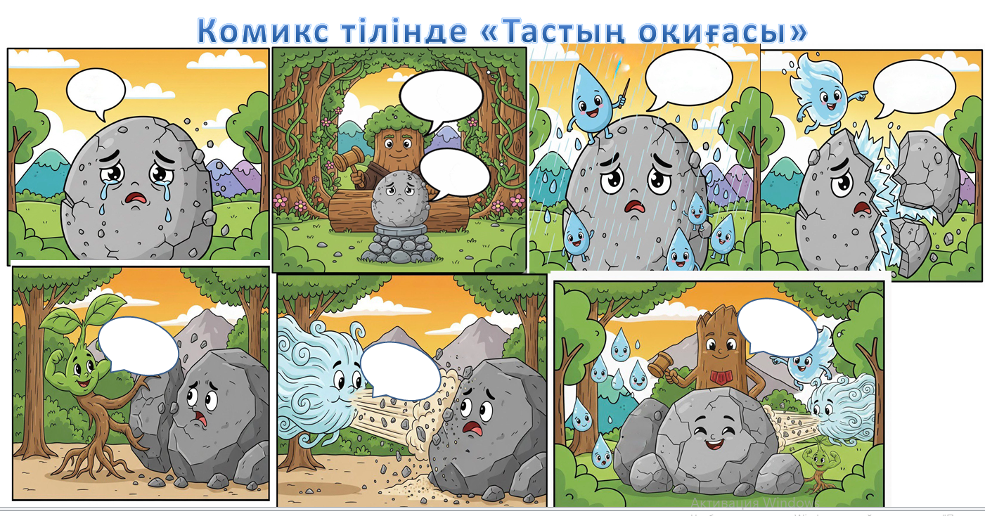 Суреттер беріліп оқушылар креативті, жаратылыстанудан алған білімін пайдалана отырып комикстегі кейіпкерлердің сөйлеу бұлттарын толтырады. |