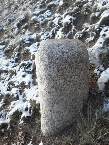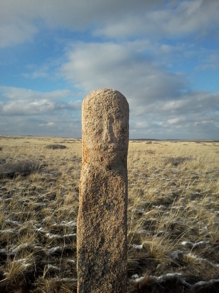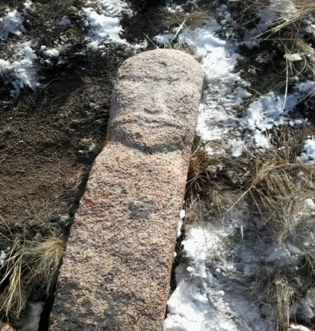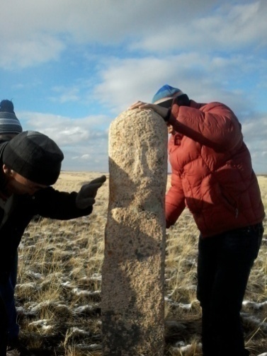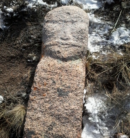 Дегенмен орнығып, жерге еніп кеткен тасты мүсіндер де бар (13- сурет). Жер бетіне 70 см шығып тұр, беті оңтүстік шығысқа қаратылған, екі көзі, мұрыны, ауызы анық көрінеді. Соған қарағанда бұл да таңбалы тас сияқты күні бойы бетіне күн түсіп тұратын жерге қойылған.