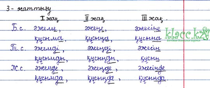 Жазба жұмыстарын түрлі формада орындайды,тірек сөздерді пайдаланып мазмұнын айтады, тәуелдік жалғау жалғанған зат есімдерді септеуді үйренеді