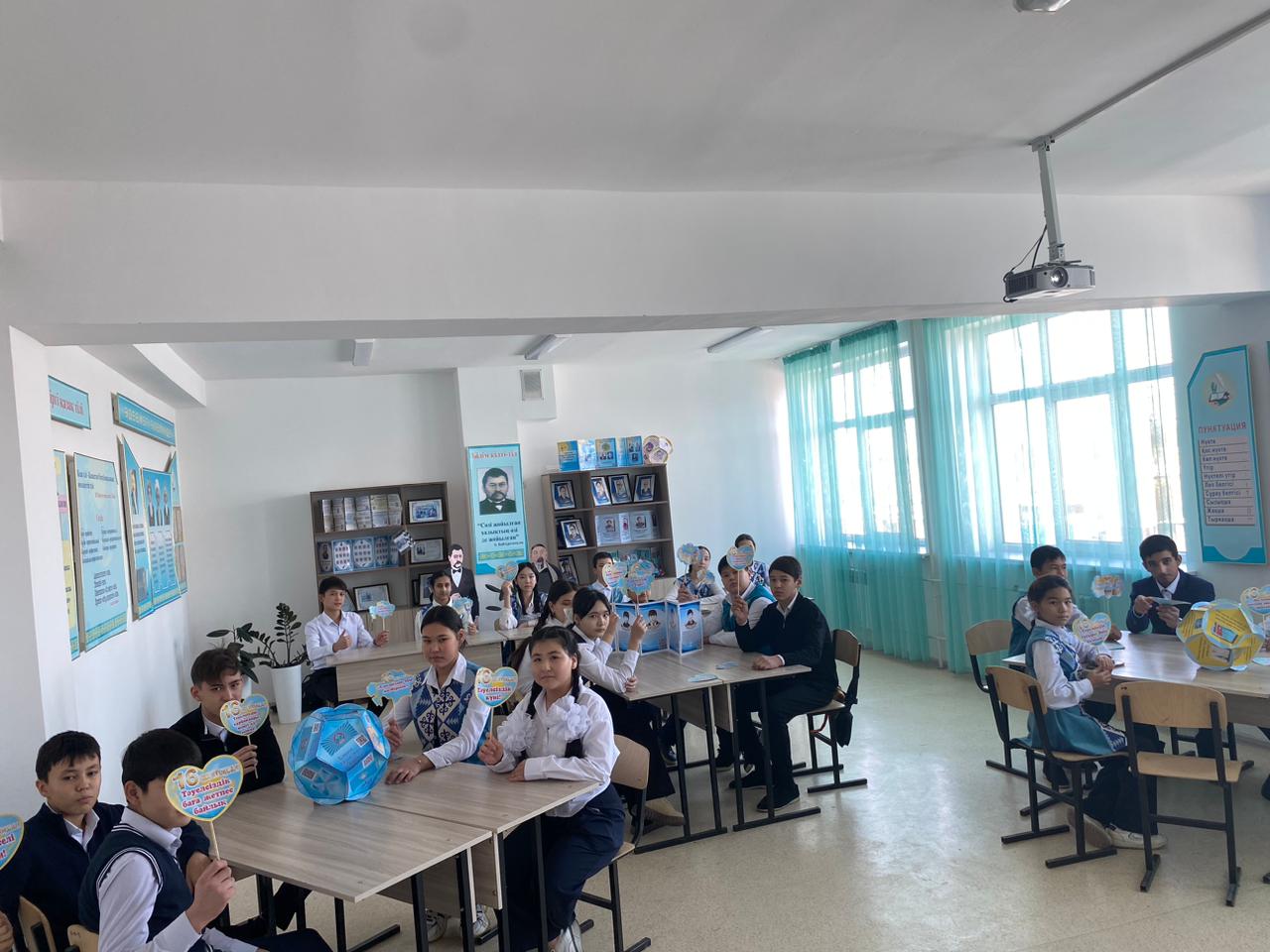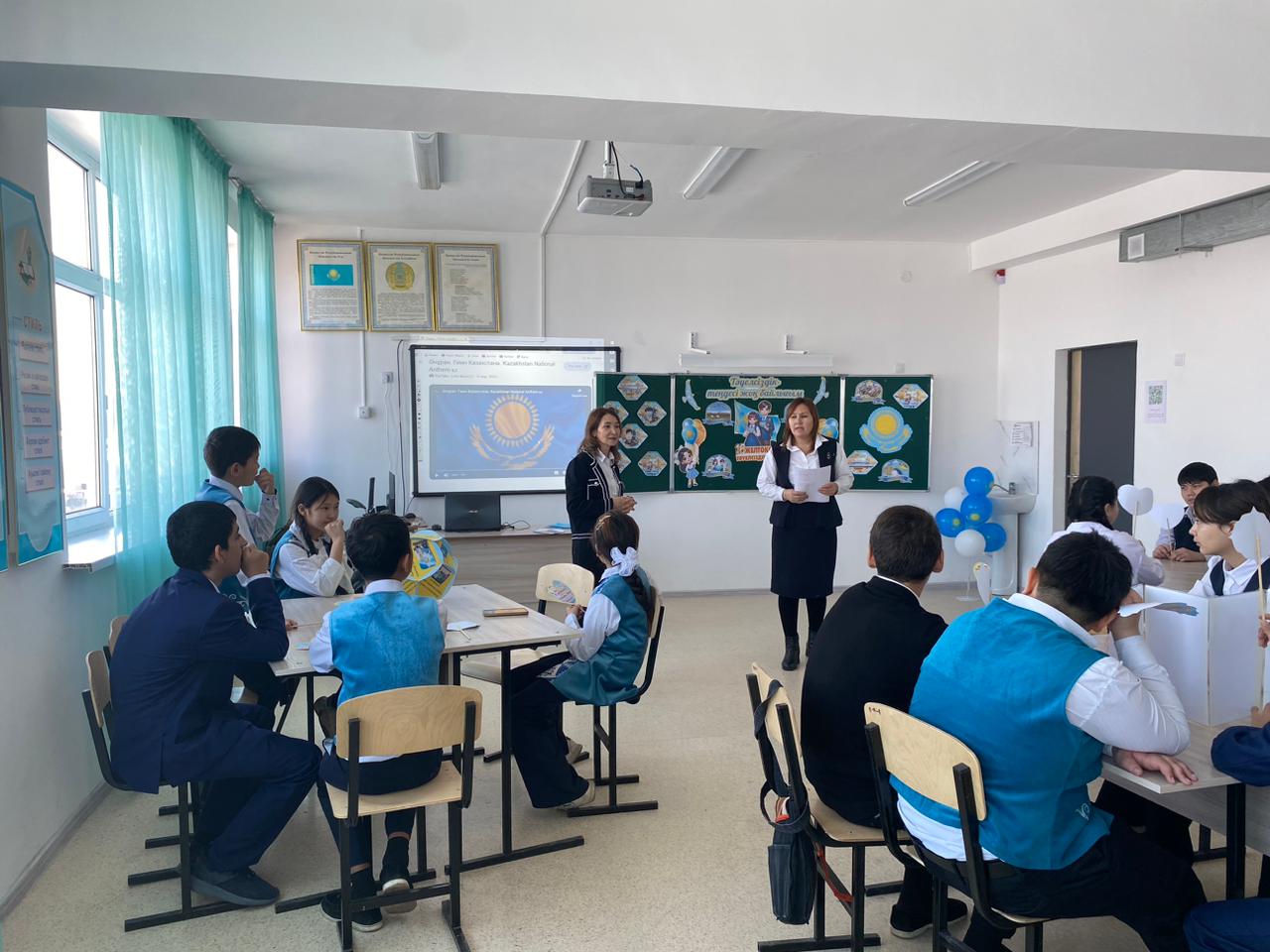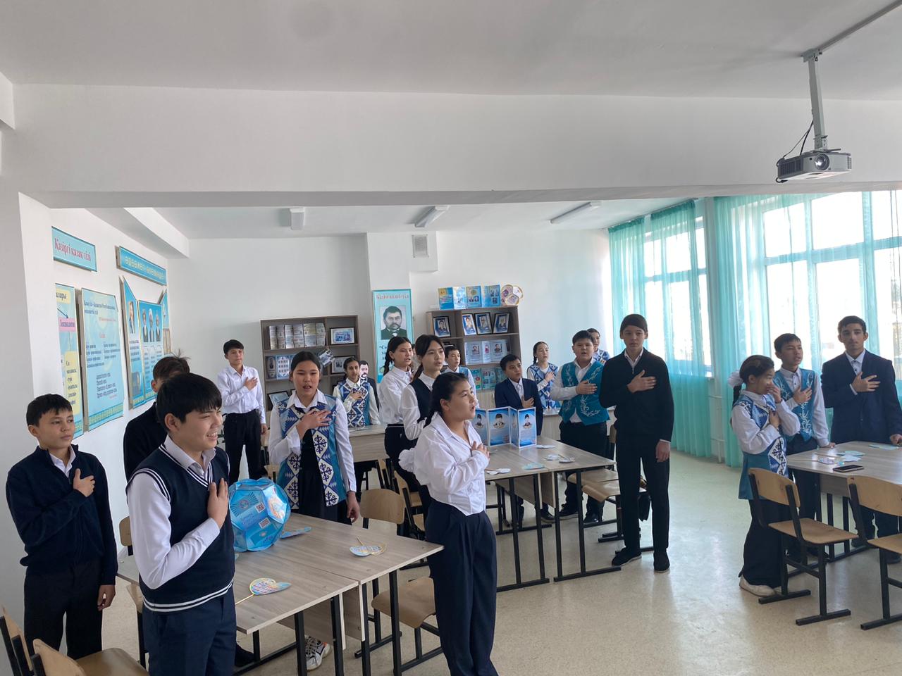 Көрнекілігі: еліміздің туы, әнұранның сөзі жазылған плакат, Елбасы суреті, «Қазақстан» энциклопедиясы.