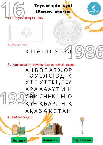 СЕРГІТУ СӘТІ (оюлар биі) 3 – тапсырма (топтық жұмыс) 1 – топ «Тәуелсіздік менің түсінігімде...» қысқаша әнгіме құрастыру 2 – топ «Тәуелсіздік менің көзіммен....» Сурет салу 3 – топ «Тәуелсіздік таңы» Өлең арнау 4 – тапсырма «Кім білгір» әдісі https://wordwall.net/play/83666/684/202