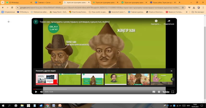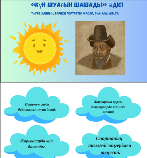 Негізгі бөлім «Ой қозғау» әдісі Оқушыларға бейне көрініс көрсетіледі https://youtu.be/E-WQFpOzkaU?si=-ndxe1utAuF1OdIe Тапсырма №1 «Күн шуағы» әдісі (Оқушыларға жалпы орындауға ұсыну) Критерий:Тәуке ханның тарихи портретін жасап, оқиғаны аяқтау.