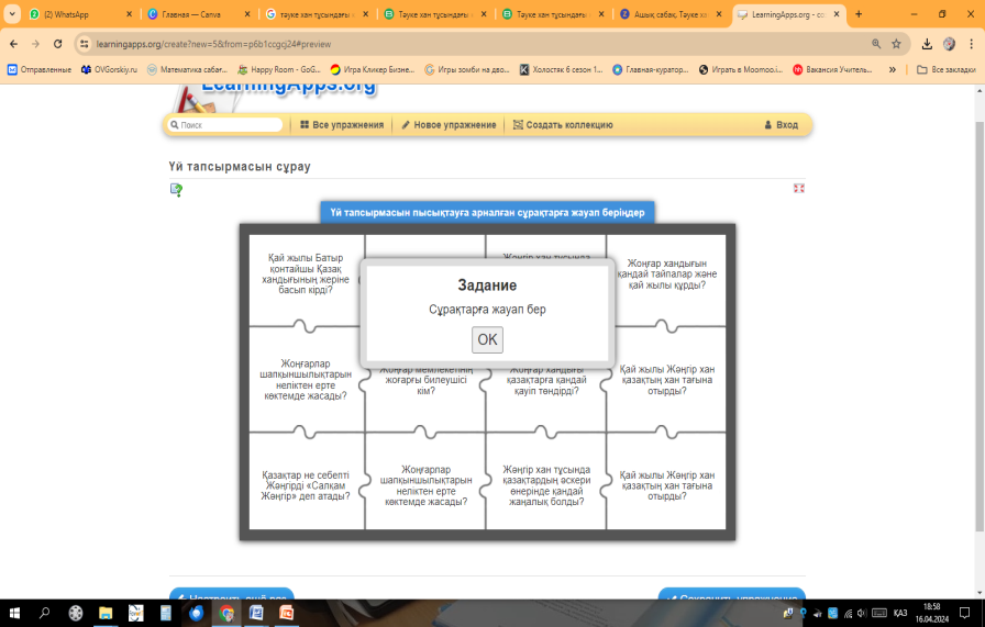 Алдыңғы білімді еске түсіру «https://learningapps.org/» бағдарламасы арқылы жүргізіледі Критерий: -Жәңгір хан туралы сұрақтарға жауап беру. -Жәңгір хан тұсындағы жасалған жорықтарды анықтау. Үй тапсырмасының сұрақтары: