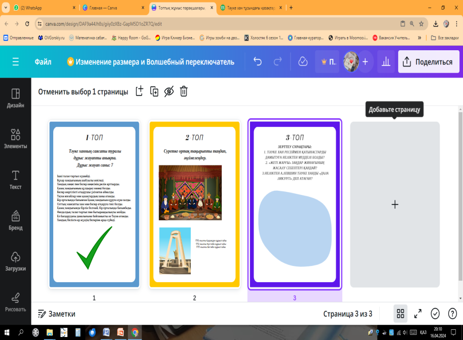 Оқушылар видео арқылы жаңа сабақты түсінеді Тәуке ханның тарихи портретін жасап, оқиғаны аяқтайды Оқулықтағы мәліметтермен таныса отырып топтық тапсырманы орындап,постер арқылы қорғайды. Берілген мозайкада жасырын тұрған сұраққа жауап береді. |