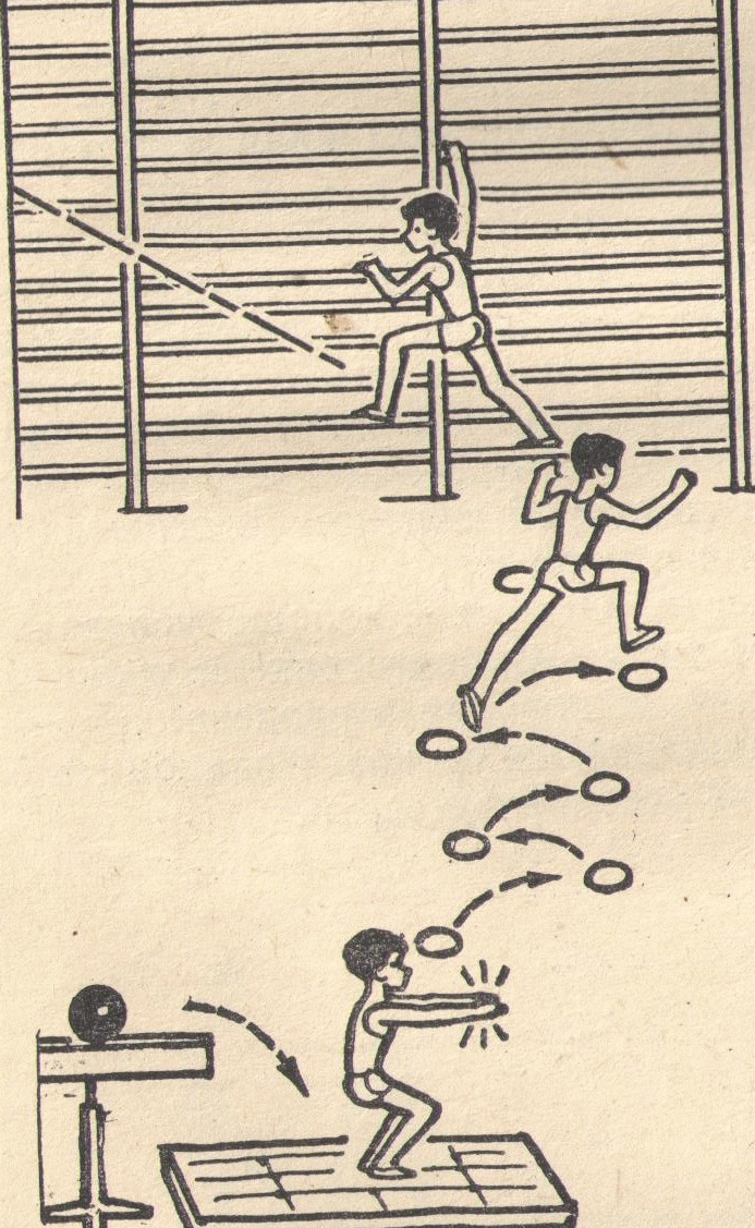 - прыжки на месте с опорой руками о стопу матов (2-3 подхода по 3-4 прыжка); - из упора стоя, руки на стопе матов, толчком ног упор стоя на коленях на стопе матов; перейти в упор присев, соскок, с мягким приземлением на обе ноги, зафиксировать Для разбега мелом чертятся круги (место разбега и место отталкивания, место приземления). – подойти шагом к месту разбега; с разбега до места отталкивания толчком двух ног, упором на две руки прыгнуть на маты на колени; дойти до конца матов; спрыгнуть на мат на обе ноги, мягко без потери равновесия. - Ребята, вы теперь оцениваете друг друга, следите за каждым прыжком и говорите что получилось а что не получилось. - И прежде чем нам возвращаться домой, давайте же поиграем с вами в игру. - Игра «Зайцы, сторож, Жучка». Приложение № 2. - А теперь давайте подведём итоги нашей игры. Кто ни разу не был пойман Жучкой, поднимите руки. Вот, ребята, на сегодняшнем уроке это самые ловкие, быстрые, смелые. «Прыгуны и пятнашки» Участники игры делятся на две равные команды, каждая из которых выстраивается вдоль боковых сторон зала лицом к середине. По жребию одна команда назначается прыгунами, вторая — пятнашками. На площадке делается разметка. В 1 м от лицевой границы площадки проводится стартовая линия (для бегунов), а впереди, через 3 м — вторая стартовая линия (для прыгунов). Перед этой линией (в 10—12 м от нее) чертят полосу шириной 1,5 — 2 м По команде учителя «На старт!» четыре игрока из команды прыгунов занимают места за второй линией. За ними тут же за ближайшую к стене линию встают в затылок четверо из команды пятнашек. По команде «Внимание!» прыгуны и пятнашки принимают положение высокого старта, а по команде «Марш!» все выбегают вперед. Задача прыгунов — быстрее достичь полосы и перепрыгнуть через нее. Задача пятнашек — успеть «осалить» прыгунов, прежде чем они сделают прыжок (пятнашки не прыгают). Если прыгуна не успеют «осалить» до прыжка, его команда получает один балл. Если «Пятнашка» коснется прыгуна рукой до начала прыжка, также получает один балл. После первых четверок в борьбу вступают вторые четверки прыгунов и пятнашек, пока все не примут участие в игре. После этого команды меняются ролями и местами на линиях старта. В итоге побеждает команда, набравшая больше победных очков. «Кузнечики» По сигналу первые номера прыжками преодолевают установленную дистанцию — 10—15 м туда и обратно, обязательно заступая за черту на противоположной стороне площадки. Как только первый участник, приземлившись за стартовой чертой, коснется рукой следующего участника, тот начинает прыжки и т. д. Побеждает команда, первой закончившая эстафету. Варианты: -прыжки на двух ногах; -прыжки на правой ноге; -прыжки на левой ноге, туда — на правой ноге, обратно — на левой или наоборот. |