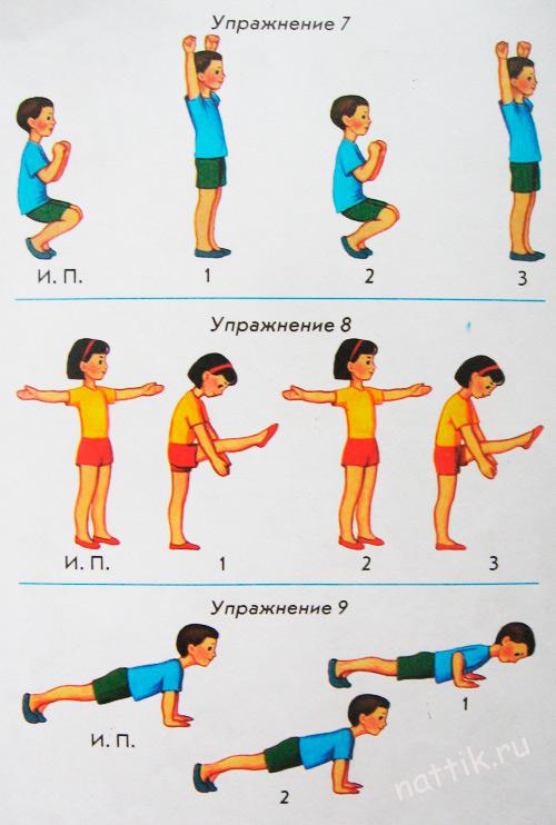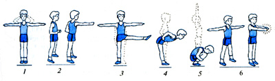 Предназначено для развития косых мышц туловища и увеличения подвижности позвоночного столба. И.П. стойка узкая руки на затылок. 1-2- поворот туловища вправо. 3-4- поворот туловища влево. 4- И.П. 4-6 р. Показать несколько аналогичных упражнений и дать возможность детям самим отметить их назначение. Упражнение№4. Предназначено для подготовки коленных суставов. И.П. полуприсед, руки на коленях. 1-2- круговое движение коленями вправо. 3-4- круговое движение коленями влево. 5-6- приседание. 7-8-И.П. 4-6 р. Скажите? «Для чего предназначено это упражнение и зачем мы его выполняем?» Обратить внимание на произвольное внимание детей. Упражнение№5. Предназначено для развития гибкости. И.П. стойка широкая руки на пояс. 1- наклон вправо. 2- наклон вперёд. 3- наклон влево. 4- И.П. 4-6р. А что развивает это упражнение? Придумайте сами упражнения, которые мы ещё не делали? Методические указания: Ноги в коленях не сгибать. Коснуться руками пола. Упражнение№6. Предназначена формирования правильной осанки и восстановления дыхания. То же самое, что и упражнение №1.