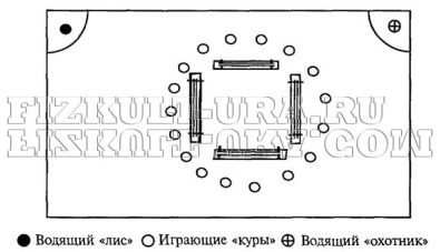 Игра «Гуси-лебеди» На одной стороне площадки (зала) проводится черта, отделяющая «гусятник». Посередине зала (площадки) ставятся четыре скамейки, образующие коридоры («дорога между горами») шириной 2 —3 м. На другой стороне площадки кладутся маты — это «гора». Все играющие, кроме двух (это волки), становятся в гусятник — это «гуси». За горой чертится кружок — «логово», в котором помещаются два «волка». Учитель произносит: «Гуси-лебеди, в поле!» «Гуси» проходят по «горной дороге» в «поле», где и гуляют. Затем учитель говорит: «Гуси-лебеди, домой, волк за дальнею горой!» «Гуси» бегут к себе в «гусятник», пробегая между скамейками — «по горной дороге». Из-за дальней горы выбегают «волки» и догоняют «гусей». Осаленные останавливаются. Пойманные подсчитываются и отпускаются в свое стадо «гусей». Играют два раза, после чего из не пойманных игроков выбирают новых «волков». И так игра проводится 2—3 раза, после чего отмечаются ни разу не пойманные «гуси» и «волки», сумевшие поймать больше гусей». Побеждают «гуси», которые ни разу не были пойманными, и «волки», сумевшие поймать большее количество «гусей». 1. «Волки» ловят «гусей» до «гусятника». 2. «Волки» могут ловить «гусей» только после слов «за дальней горой». 3. Нельзя прыгать через скамейки или бежать по ним. (Упражнение «Гонка мячей». Участники становятся в колонну. Им нужно передать мяч сверху, снизу, слева, справа из рук в руки. Это упражнение развивает быстроту движений рук, собранность, гибкость.