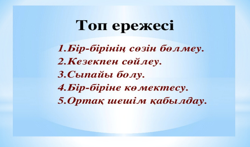 Нейрожаттығу лар арқылы амандасады. Фигуралар арқылы топқа бөлінеді. Топ ережесін басшылыққа алады.