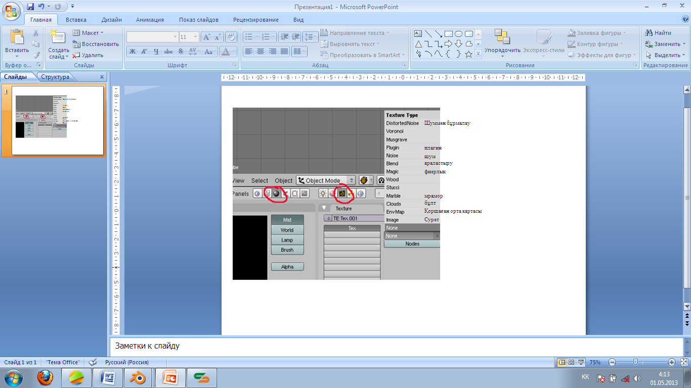 Blender бағдарламасында текстураны қолдану үшін келесідей батырмалар көмегіне жүгінеміз: Shading (F5) және Texture Buttons. Модельге бірнеше текстураны қолдануға болады (олар қатпар сияқты орналасады). Егер қатпар текстурадан тұрса, онда Texture панелінде қатпар бағанында «Tex» деген жазу болады. Әрі қарай Texture Type тізімінен керекті текстураны таңдаймыз. (3.7.1-сурет).