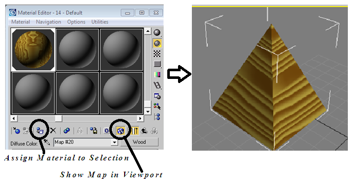Енді осы пирамидаға текстура саламыз. Ол үшін Material Editor терезесін шақырамыз. Standard типінен материалды өңдеу терезесін ашамыз: Diffuse батырмасын шертеміз – Material/Map Browser –ден керекті текстураны таңдаймыз, мысалы, Wood текстурасын белгілеп Ok батырмасын шертеміз. (3.7.6-сурет).