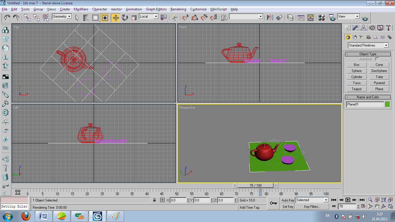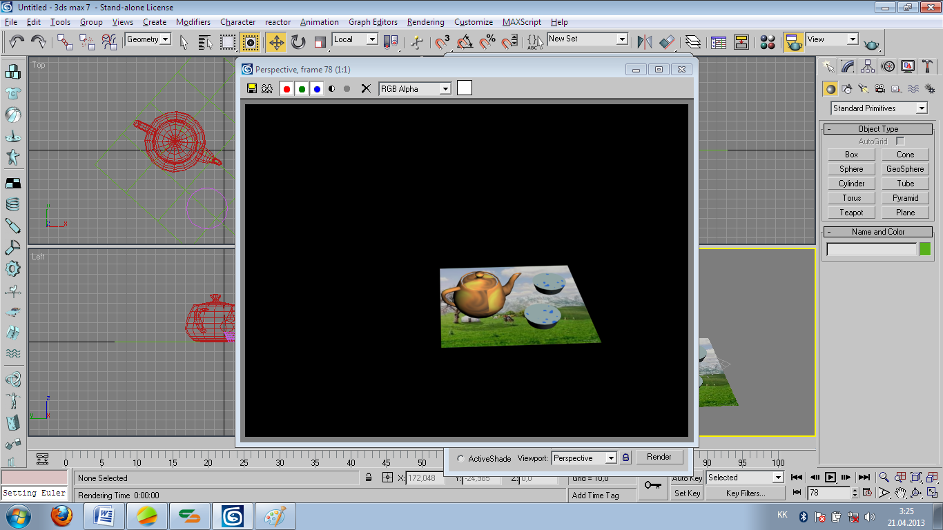 Geometry - Standard Primitives – тен Plane, Cone, Teapot нысандарын пайдаланып 3.7.8а-суреттегідей кескін құрастыр. Ол нысандарға 3.7.8б-суреттегідей текстура қолданып түр- түстерін өзгерт.