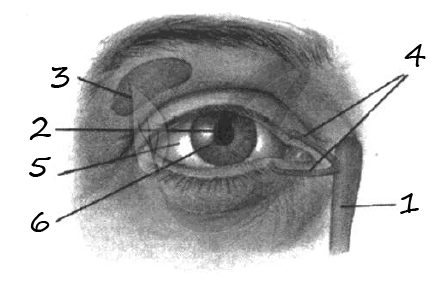 1 2) радужка 3) слёзная железа 4) слёзные протоки 5) зрачок 6) склера