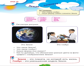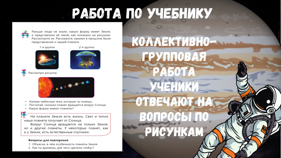Работа по учебнику. К) Работа в коллективе. Земля — это планета, на которой есть жизнь. Глобус — это уменьшенная модель Земли. (К) Работа над лексической и грамматической темой урока. (Г) Работа в группах. Раньше люди не знали, какую форму имеет Земля, и представляли её такой, как показано на рисунках. Рассмотрите их. Расскажите, какими в прошлом были представления о нашей планете.