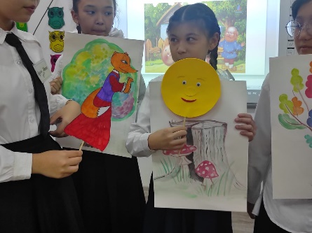 Дети выходят со своими персонажами, приготовленные на предыдущем уроке. Персонажи: дед, бабка, колобок, заяц, волк, медведь, лиса. Ведущая читает сказку «Колобок». Остальные учащиеся выносят и демонстрируют декорации (деревья, пенек, солнышко, облака) Дескрипторы: учащиеся - определяют героев постановки сказки «Колобок»; - выполняют эскиз декорации спектакля; - предлагает идею мизансцены; - распределяют роли персонажей и озвучки; - обсуждает свою работу и работы товарищей. Прочитай Разработка сценария. Создание героев и декорацийвучебнике §10на страницах 30 - 31 |