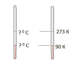 - Цельсий шкаласы мен Кельвин шкаласы арасындағы байланыс формуласын жазыңыз._______________________ -Берілген суретті пайдалана отырып, белгісіз термометр көрсеткішін анықтаңыз. -Сұйықтық термометрде температураны өлшеу үшін температураның қандай шамаға тәуелділігі және қандай қасиеті пайдаланылады?