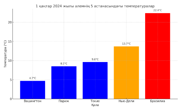 Жоғарыдағы диаграммада 2024 жылдың 1 қаңтарындағы әлемнің 5 астанасындағы ауа температурасы көрсетілген. Температуралар Цельсий градусымен берілген. Осы диаграммадағы мәліметтерге сүйеніп әр топ екі сұрақтан құрастырыңдар |