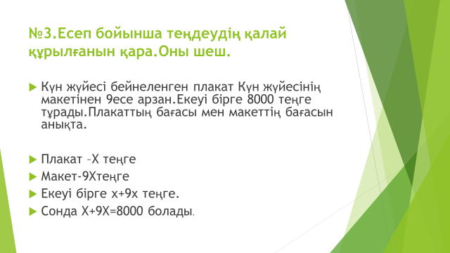 №3.Есеп бойынша теңдеудің қалай құрылғанын қара.Оны шеш.