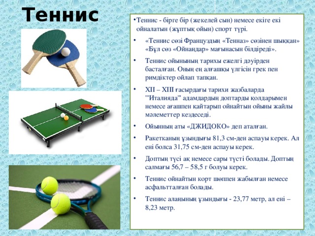 Теннис ойынына керекті құралдар: Ракетка. Ракетканың ұзындығы 81,3 см-ден аспауы керек. Ал ені болса 31,75 см-ден аспауы керек. Доп. Доптың түсі ақ немесе сары түсті болады. Доптың салмағы 56,7 – 58,5 г болуы керек. Корт. Теннис ойнайтын корт шөппен жабылған немесе асфальтталған болады. Теннис алаңының ұзындығы - 23,77 метр, ал ені – 8,23 метр. Ереже бойынша теннис ойнау. |