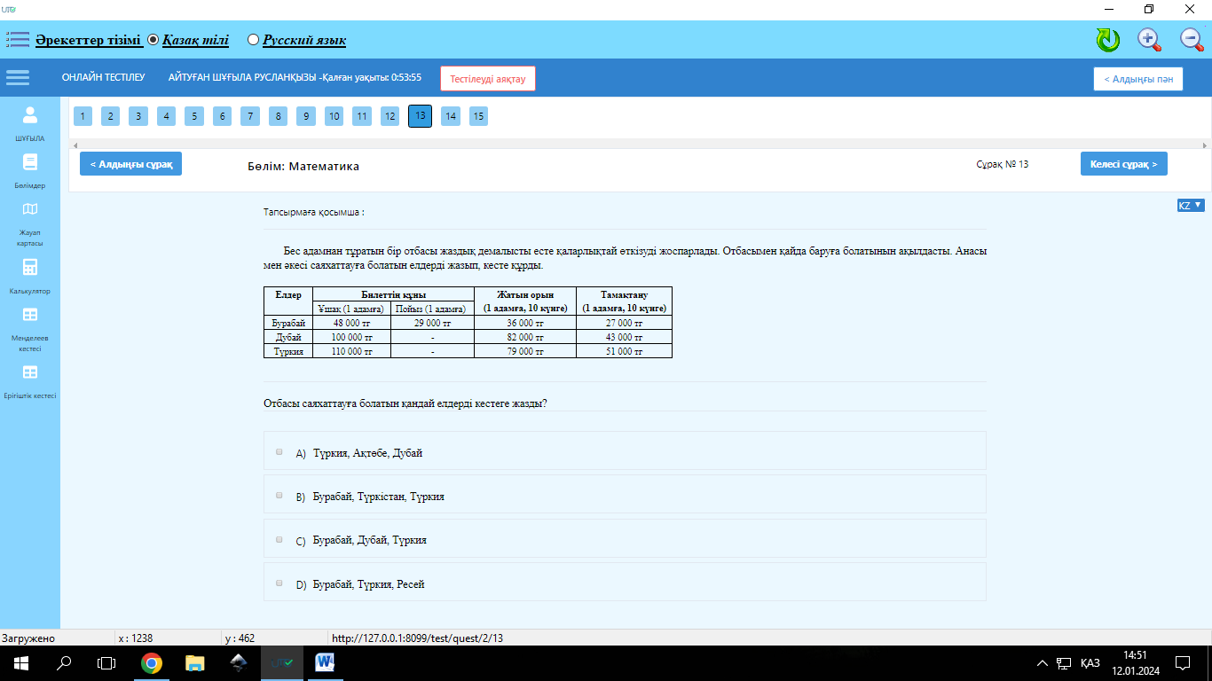 15. Бес адамнан тұратын бір отбасы жаздық демалысты есте қаларлықтай өткізуді жоспарлады. Отбасымен қайда баруға болатынын ақылдасты. Анасы мен әкесі саяхаттауға болатын елдерді жазып кесте құрды.