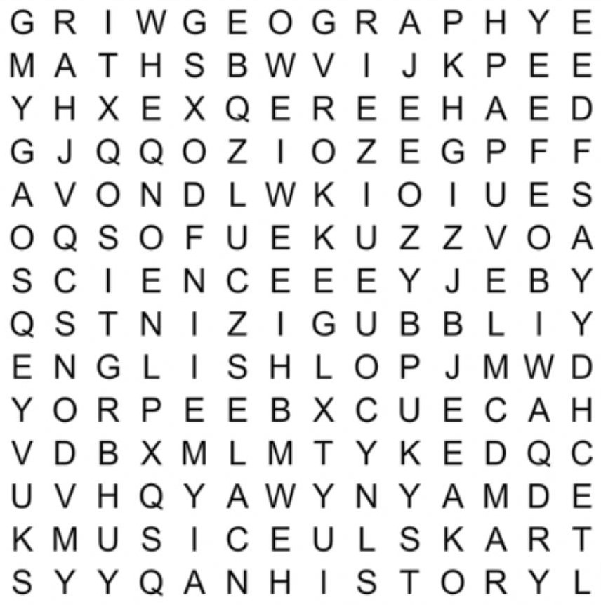 3. Find 8 (school subject) words hidden in the puzzle and write them below