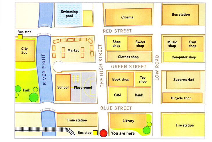 12) Go along the High Street and turn right into Blue Street. Turn left into Low Road and then go across Green Street. What’s on the corner, on the left, opposite the cinema?