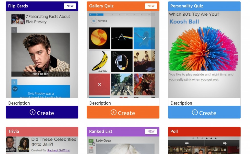 Playbuzz.com Facebook және Google+ аккаунттары арқылы тіркелуге мүмкіндік береді. Мұнда тест нұсқалары көбірек: жеке бас қасиеттерін, қандай да бір білім саласындағы білім деңгейін анықтау, галерея-тест, бағалау парақтары.