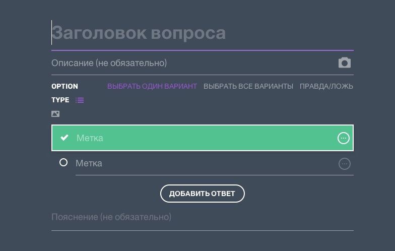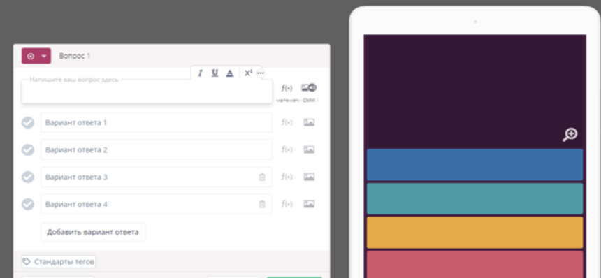 Тестті алуан түрлі етіп безендіруге болады – сіз мұнда тек компьютерден сурет жүктеп қана қоймай, сілтеме бойынша сурет не видео алып келе аласыз. Тест санатын таңдау және тегтерді көрсету міндетті.