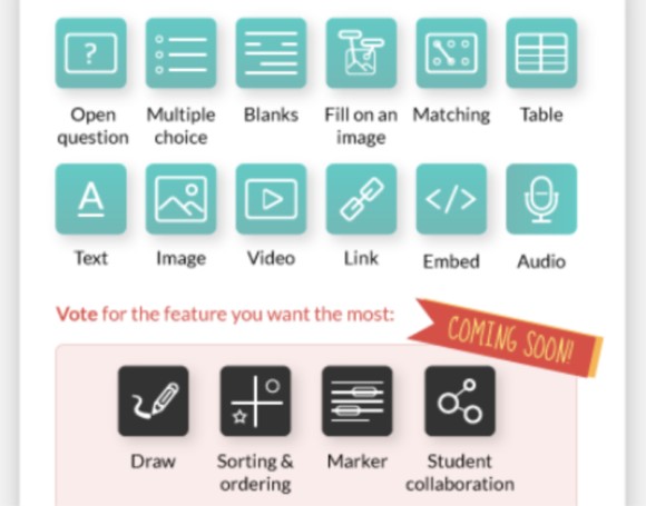 "Wizer" әдемі және жағымды дизайнымен ерекшеленеді және ерекше, шабыттандыратын жаттығулар жасауға мүмкіндік береді. "Open question", "multiple choice", "tables" және тағы басқа жаттығуларды осы қызметтің көмегімен жасауға болады. Жаттығуларыңызға аудио және бейне материалдарды, суреттерді қосыңыз. Ресурсты айына 7 доллар төлеу арқылы пайдалануға болады.