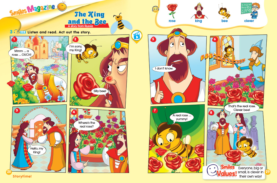 T: Hello, pupils! P: Hello, teacher T: How are you? P: We are OK, thank you. And you? T: I’m OK. Thank you. Sit down, please. Dividing into two groups with colour bears picture. Now, pupils I want to divide into two groups. Repeat after me new words. Chorally, individually, in group “Zebra” Open your book-кітабыңды аш Mother-ана Yellow-сары Grandpa-ата Stand up-орныңнан тұр Grandma-әже Grass-шөп Chair-орындық Paintbrush-қылқалам Green-жасыл Flashcards Карточка тарату арқылы тақырып анықтау. Show the story about “The King and The Bee”. New words Bee-ара King-патша Rose-раушан Clever-ақылды Open your activity book on page 16. Exercise 5. Colour. Then tick “Touch, show” game. Dance “Charlie Bear” Repeat after me new words. Chorally, individually, in group Reflection. Bee and rose. Раушан гүлін тақтаға жапсырамыз. Егер сабақты түсінсек арамызды раушан гүліне қондырамыз, егер сабақты түсінбесек раушан гүліне арамызды қондырмаймыз.