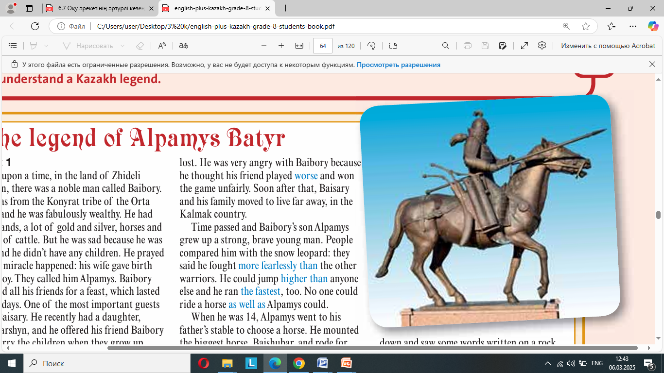 Once upon a time , in the land of Zhideli Baisyn, there was a noble man called Baibory . He was from the Konyrat tribe of the Orta zhuz and he was fabulously wealthy . He had vast lands , a lot of gold and silver , horses and herds of cattle. But he was sad because he was old and he didn’t have any children . He prayed and miracle happened: his wife gave birth to a boy. They called him Alpamys . Baibory invited all his friends for a feast, which lasted forty days . One of the most important guests was Baisary .He recently had a daughter, Gulbarshyn, and he offered his friend Baibory to marry the children when they grow up . Baibory gladly agreed . After several years , there was another big feast, with many horse games and competitions. The two friends competed in a kokpar game and Baisary played well, but he lost .He was very angry with Baibory because he thought his friend played worse and won the game unfairly . Soon after that , Baisary and his family moved to live far away , in the Kalmak country . Time passed and Baibory’s son Alpamys grew up a strong,brave young man . People compared him with the snow leopard : they said he fought more fearlessly than the other warriors. He could jump higher than anyone else and he ran the fastest , too. No one could ride a horse as well as Alpamys could . When he was 14, Alpamys went to his father’s stable to choose a horse. He mounted the biggest horse, Baishubar, and rode for many days and nights. The horse took him further and further into the steppe until they reached the Kalmak country. Finally, the horse stopped on top of a hill. In the distance , Alpamys could see a large army. Then he looked down and saw some words written on a rock on the ground. The first word was his name, but he could see the rest less clearly because the letters were smaller. He got off the horse to read the inscription. It was a message for him from Gulbarshyn, Baisary’s daughter. Task 2. Knowledge. Білу How is Alpamys describe in the text? As a ……….