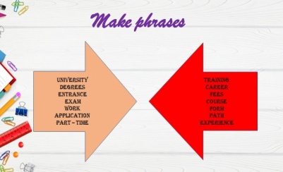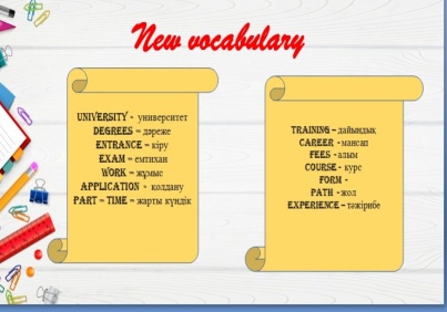 New vocabulary Teacher explains new vocabulary and asks repeat after her. University - университет Degrees – дәреже Entrance – кіру Exam – емтихан Work – жұмыс Application - қолдану Part – time – жарты күндік Training – дайындық Career - мансап Fees - алым Course - курс Form - Path - жол Experience – тәжірибе