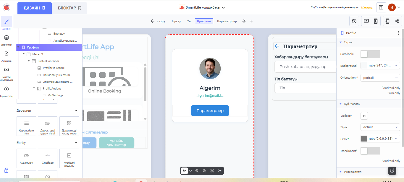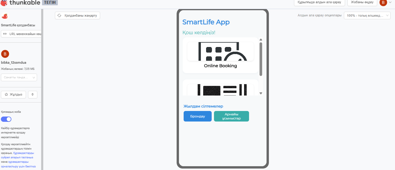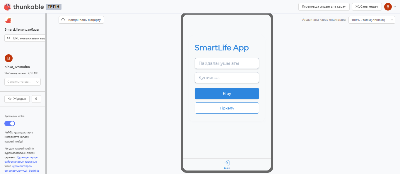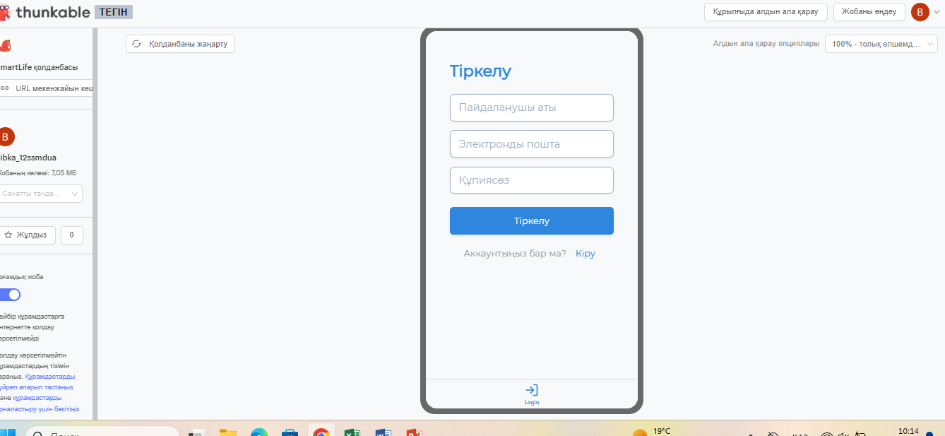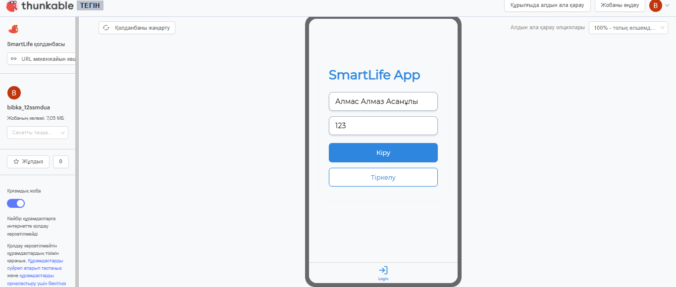 https://thunkable.com/ қосымшасы арқылы Iphone 14/15 pro max сәйкес келетін интерфейстер жасадық, оның ішінде тапсырма бойынша логин және құпия сөзден бастап барлығын қамтыдық.