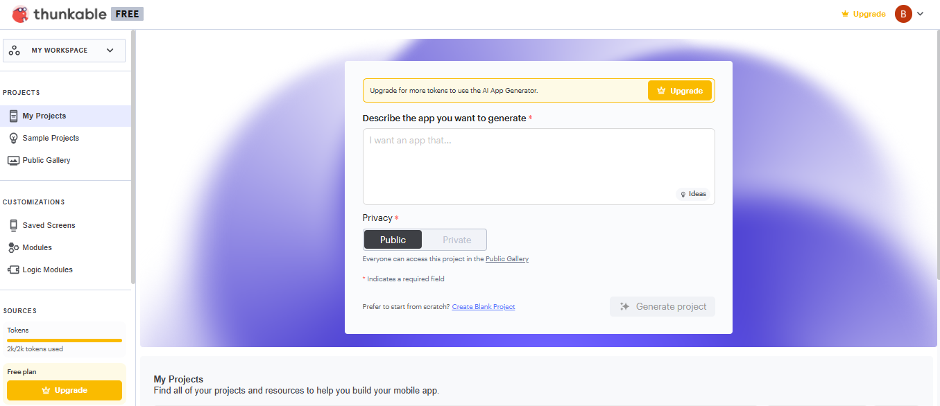 Thunkable бағдарламасында жобалар бетін ашқанда, бастаудың екі жолын көресіз: