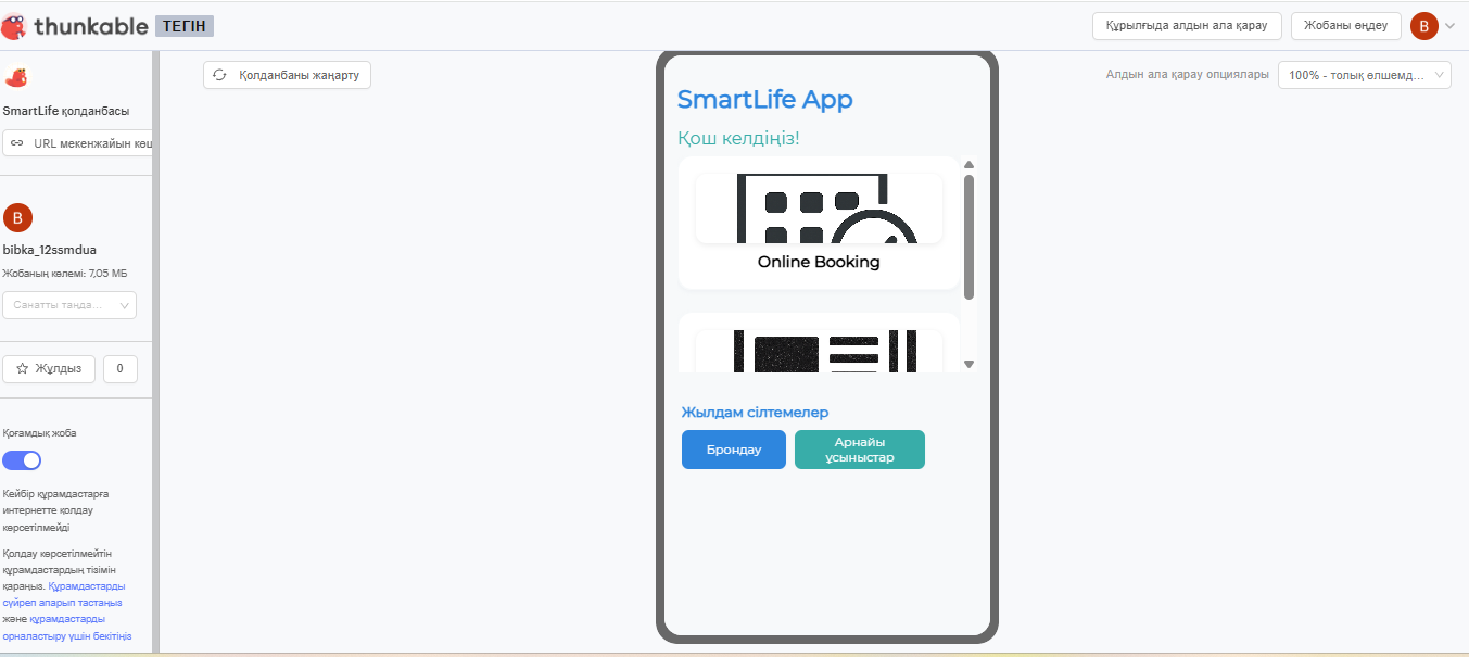 Thunkable сіз үшін жұмыс істейтін қолданба жобасын лезде жасайды. Нәтиже мыналарды қамтиды: