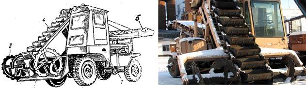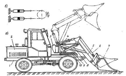 Жартылай бұрылмалы тиегіш (44-сурет) шөмішті және басқа да жұмысшы органдарды алға және машина ось бойынан екі жаққа (әр жағына 900 -тан аса) жүктен арылуды қамтамасыз етеді. Мұндай тиегіш арнаулы пневмодоңғалақты екі белдігі де жетекші шассиден, бұрылмалы платформаға жинақталған тиегіш жабдықтан тұрады. Жартылай бұрылмалы тиегіштің қуат көзі ретінде, артқы басқару белдігінің үстіне орналасқан дизель 2 (44, а-сурет) қолданылады. |
