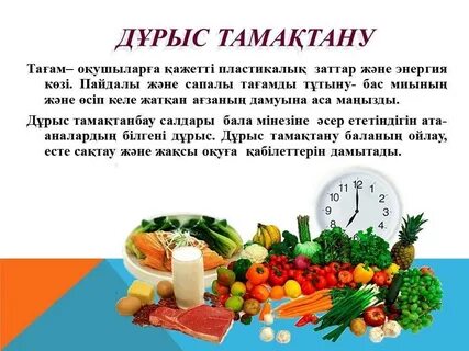 Балалар мен жасөспірімді дұрыс тамақтандыру олардың денсалығын нығайтып, дене және ой қабілетінің дамуына мүмкіндік береді, еңбек ету мен сабақ үлгеру қабілетін арттырады. Егер тамақтану дұрыс ұйымдастырылмаса, тиімсіз, яғни жеткіліксіз болса, организмде метаболизм , зат алмасу бұзылып, оның айналадағы ортаның зиянды әсеріне әне әртүрлі жұқпалы ауруларға қарсы тұрарлық қабілеті төмендейді Тамақтану тәртібі Ас қабылдауда белгілі бір уақытқа бағыну, сондай – ақ тамақтану кезінде астың мөлшерін және ас мәзірін сақтау деген ұғымды білдіреді. Тамақтану режіміне мына төмендегі принциптер енеді.