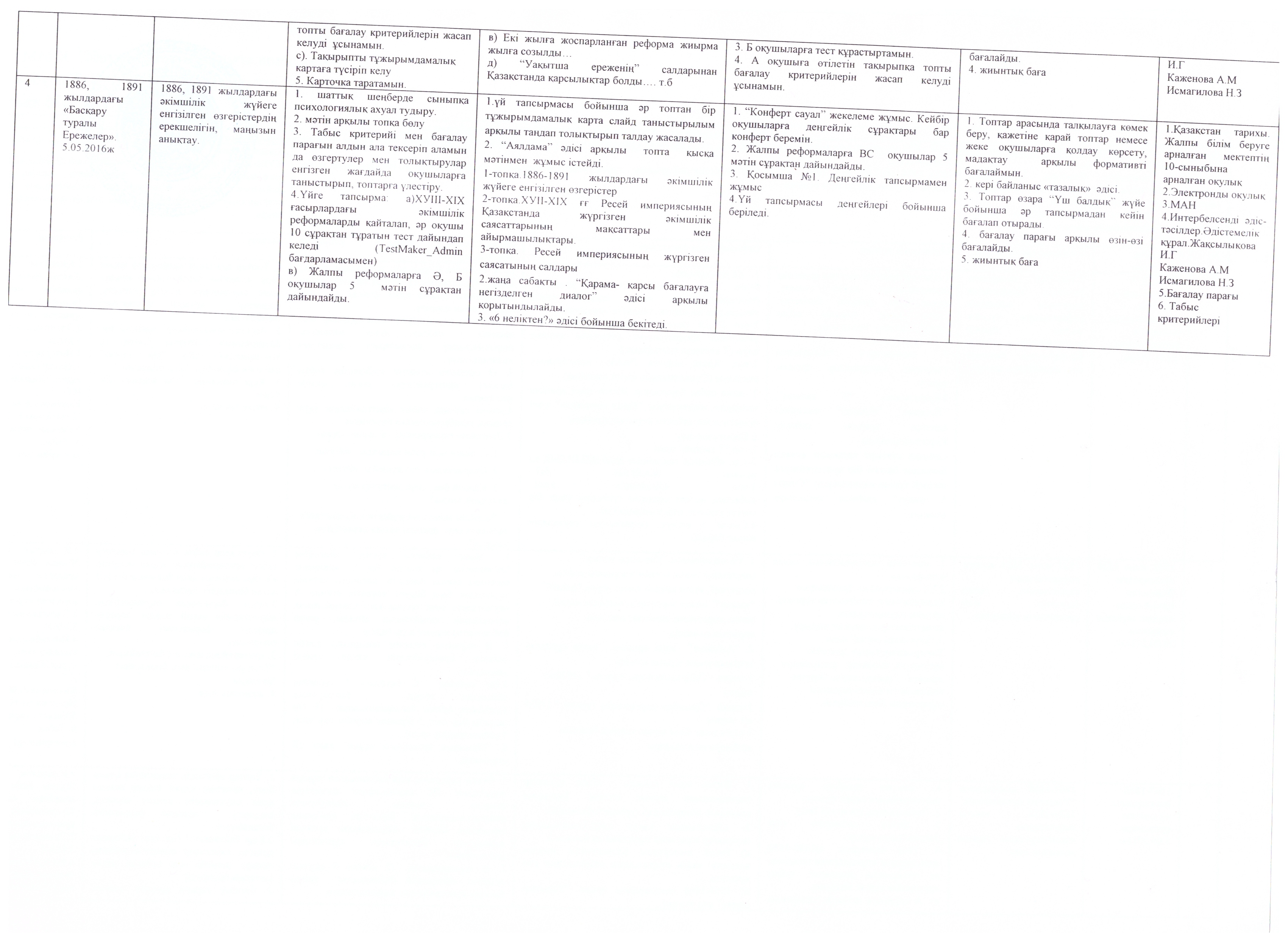 1.Қазақстан тарихы. Жалпы білім беруге арналған мектептің 10-сыныбына арналған оқулық 2.Электронды оқулық 3.МАН 4.Интербелсенді әдіс-тәсілдер.Әдістемелік құрал.Жақсылықова И.Г Каженова А.М Исмагилова Н.З Бағалау парағын кезең сайын топ басшылары бағалап отырады. Ауызша формативті бағалау. Топтардың қасына барып, оқушыларға қолдау көрсетіп отырамын. Қарсылас топтар, ой қосуларына болады. |