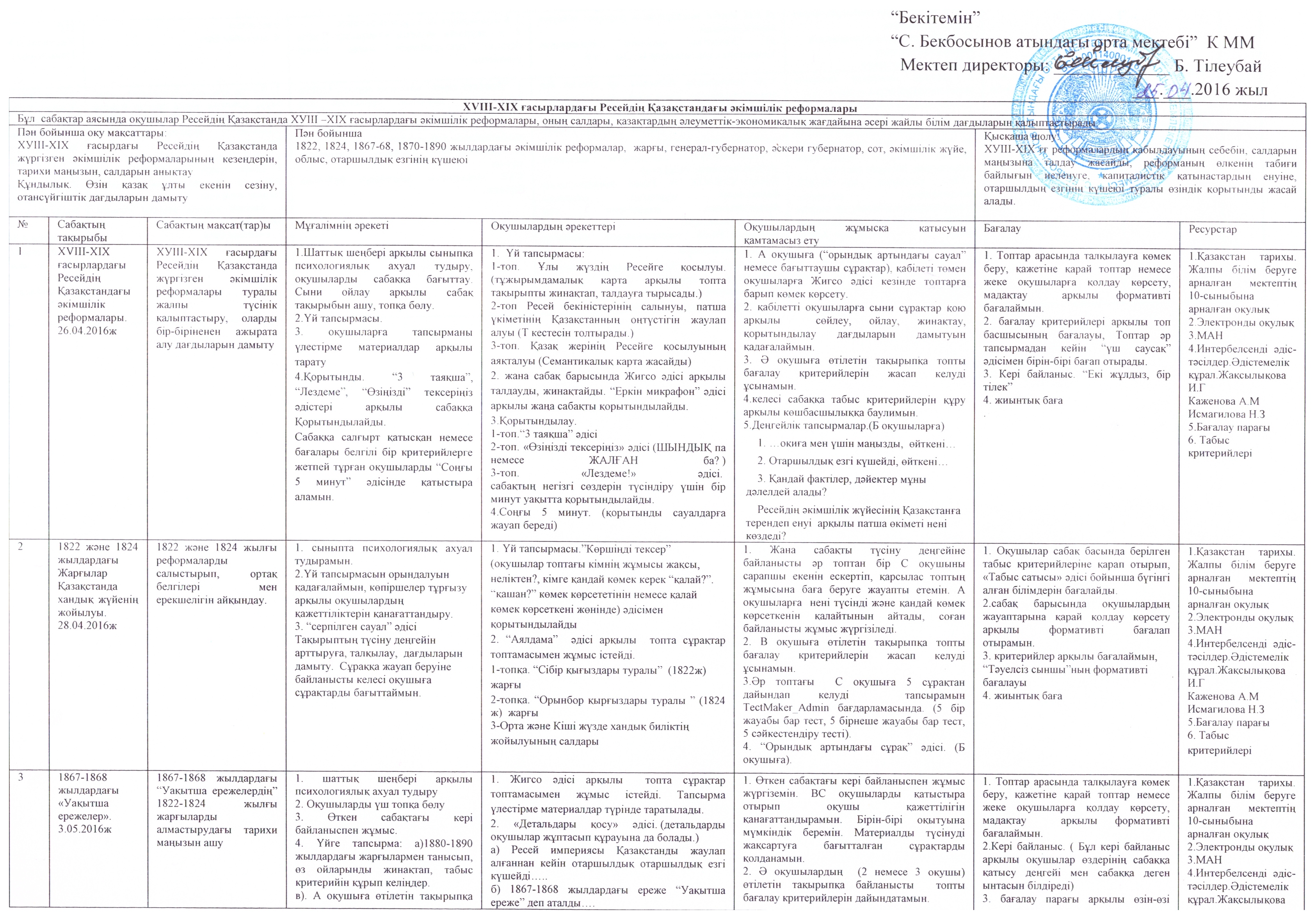 Тиімді оқыту бағдарламасы бойынша бірінші бетпе-бет кезеңінде алған теориялық білімімді тәжірбиемен ұштастыру мақсатында, 7 модульді ықпалдастыра отырып, өзім жетекшілік ететін 10 сыныптың Қазақстан тарихы пәнінің “ХУІІІ –ХІХ ғасырлардағы әкімшілік реформалар” тарауына орта мерзімді жоспарлауын жасаған болатынмын. Орта мерзімді жоспарлауда бұрынғы күнтізбелік жоспардың атауы ғана емес бүкіл құрылымына өзгеріс енген болатын. Оқыту мен оқудағы өзгерістерімді мектеп басшылығы да, әріптестерім де, өзімнің тәлімгерім Жанпеисова Айжан Нығыметқалиқызы да қолдап, қажет кезінде өздерінің көмегін көрсетті. Ал, 10 –сынып оқушылары бұрын да топтық, жұптық жұмыстар арқылы сабақтар өткізіліп жүргендіктен топта жұмыс істеу қиындық тудырмады. Дегенмен, курсқа дейін көптеген әдістерді, тіпті кері байланыстың өзін дұрыс қолданбаған екенмін. Сондықтан оқушыларға көптеген әдістерді қайта түсіндіріп, қарастыруға тура келді. Сондай-ақ бірінші бетпе-бет кезеңінде жоспарланған орта мерзімді жоспарлауға біраз өзгерістер мен толықтырулар енгіздім. Себебі, нәтижелі білім алу үрдісі өздігінен біліп, таныта білген білі