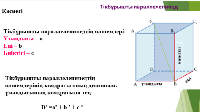 10.3.7 - тікбұрышты параллелепипедтің қасиеттерін қорытып шығару және есептер шығаруда қолдану; |