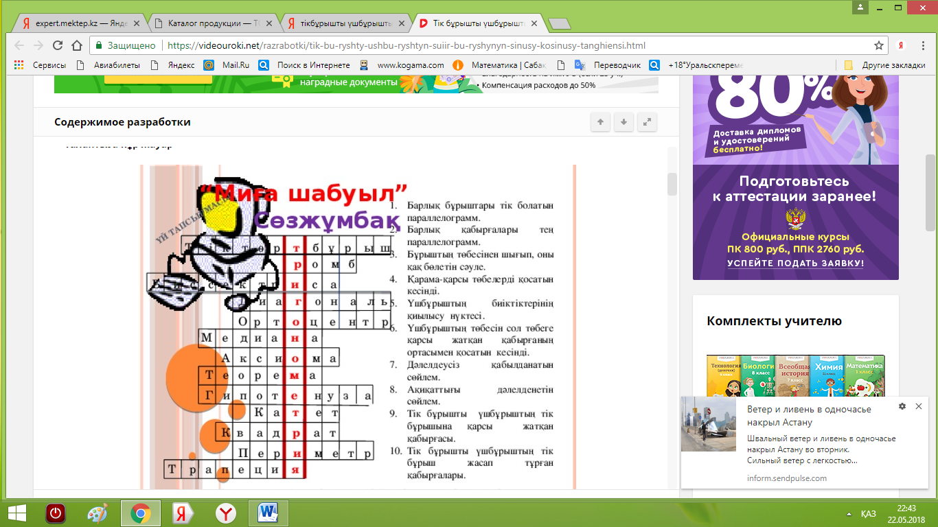 Дескриптор: Білім алушы 1. Тең бүйірлі үшбұрыш салады; 2. Тең бүйірлі үшбұрыш биіктігін жүргізеді; 3. А бұрышының тангенсін табады. Дескриптор: білім алушы 1.Суреттен тік бұрышты үшбұрыштың элементтерін ажыратады, қатынасын жазады; 2.Сүйір бұрышының тангенсінің (котангенсінің) анықтамасын қолданады; 3.Ағаштың биіктігін анықтауға болатынын біледі. |