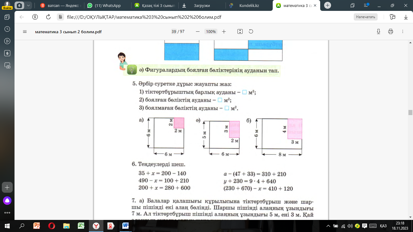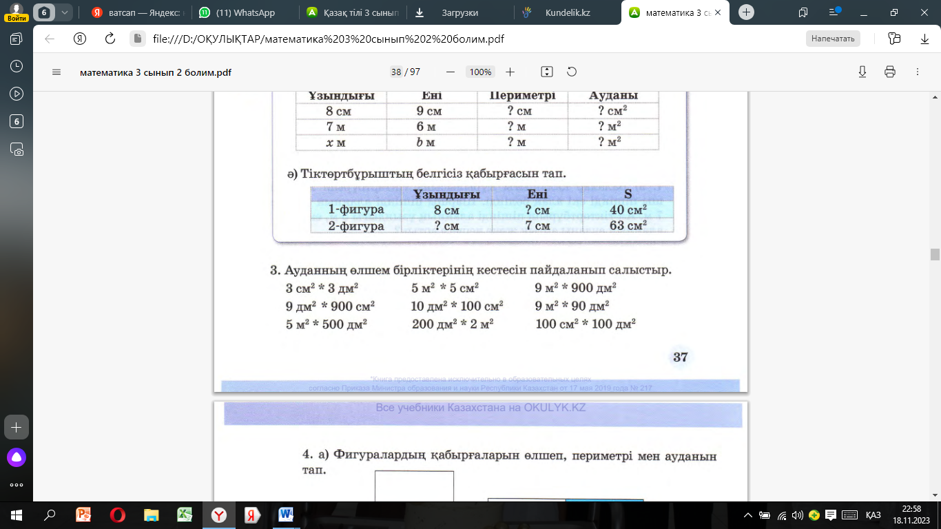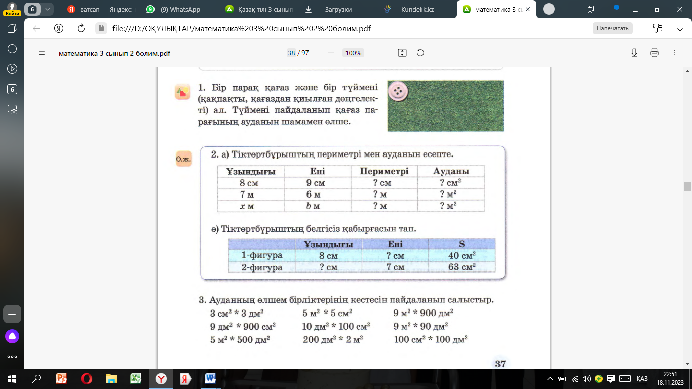 1. суреттегі тіктөртбұрыштың барлық ауданын табады 2.суреттегі тіктөртбұрыштың боялған бөлігінің ауданын табады 3.суреттегі тіктөртбұрыштың боялмаған бөліктің ауданын табады 4. екінші суреттегі тіктөртбұрыш туралы мәлімет жазады 5.үшнші суреттегі тіктөртбұрыш туралы мәлімет жазады |