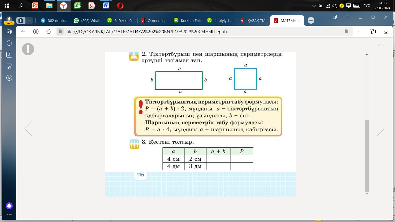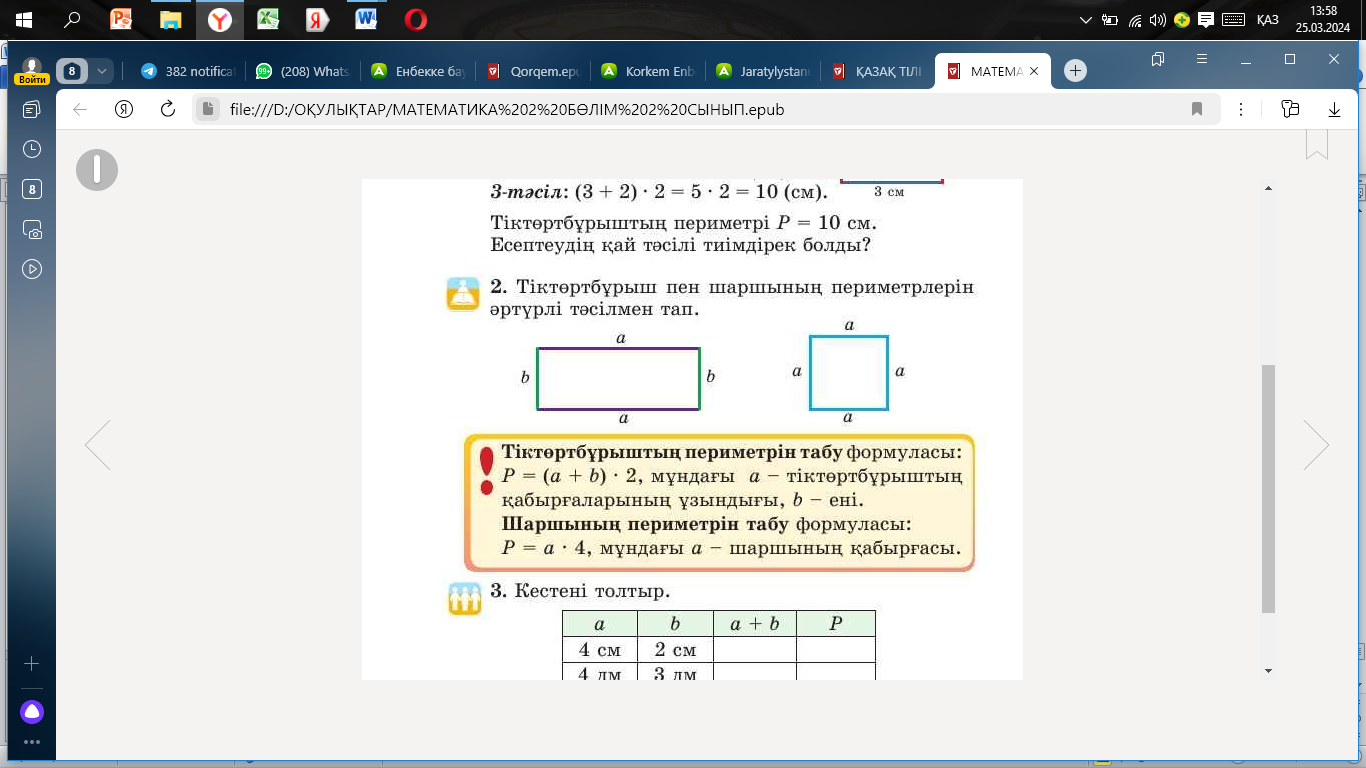 2.5.1.5.** Тіктөртбұрыш (шаршының) ұзындығы, ені, периметрін табуға берілген есептерді талдау және шығару, кері есептерді құрастыру және шығару. |