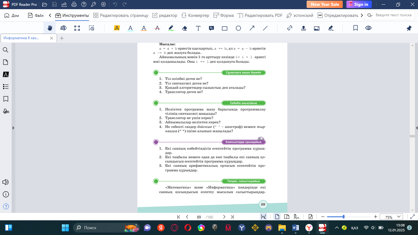 Оқулықпен жұмыс. Жаңа білім Тіл әліпбиі-программаның элементтерін құруда қолданылатын симболдар жиынтығы. Программалау тілінің синтаксисі- программа жазу барысында сақталуға тиіс тіл ережелеріңің жиынтығы. Транслятор- берілген программалау тіліндегі программалау кодын машиналық кодқа түрлендіретін арнайы программа. Айнымалылар –программаның орындалуы барысында мәндерді қабылдай алатыншамалар. Айнымалылар программадағы ақпараттың орналасу орнын анықтау үшін қолданылады. Бөліміндегі ақпаратпен танысып, төмендегі сұрақтарға жауап береді және тапсырманы компьютерде орындайды