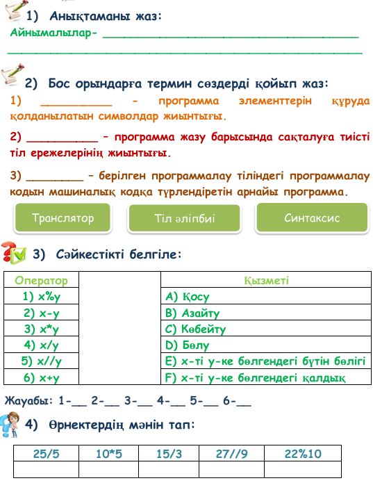 №1 мақсатқа бағытталған жеке тапсырма. Өрнектердің мәнін тап: 25/5 10*5 15/3 27//9 22%10