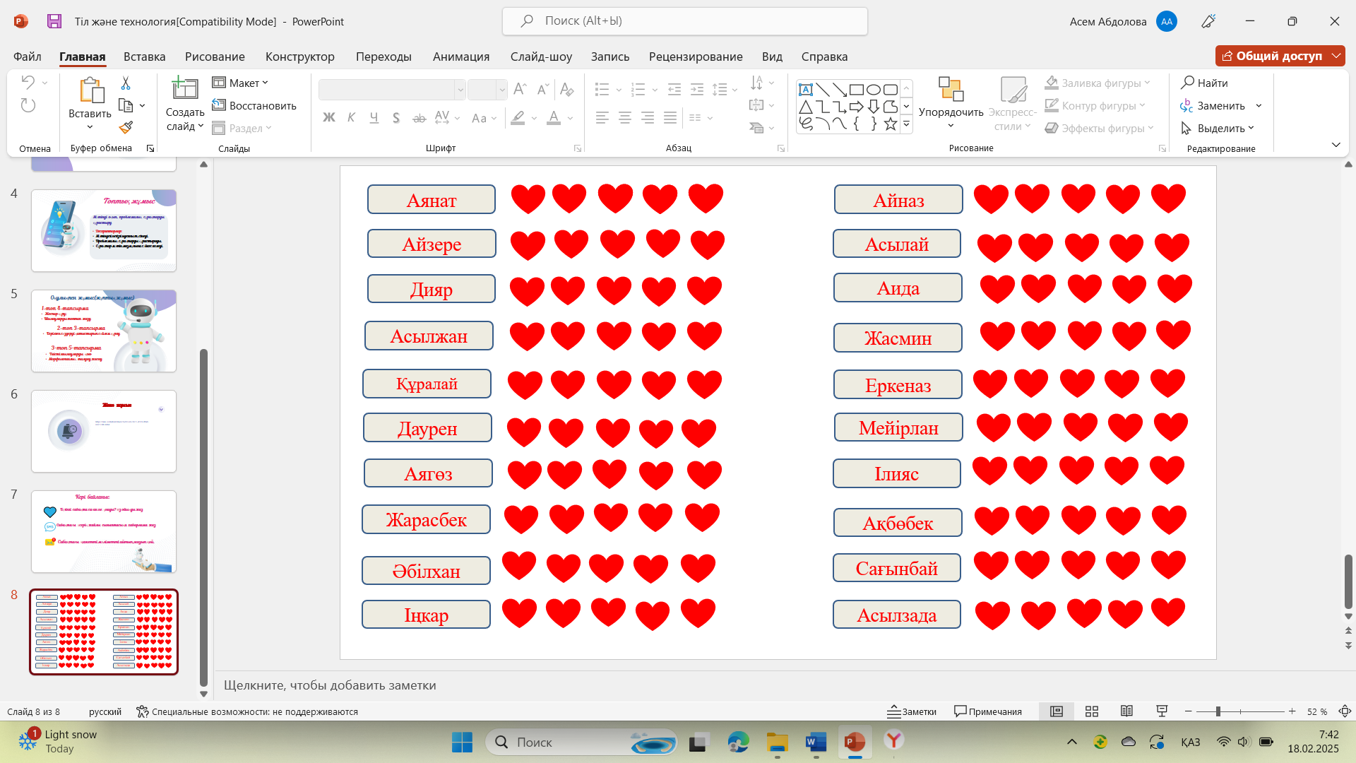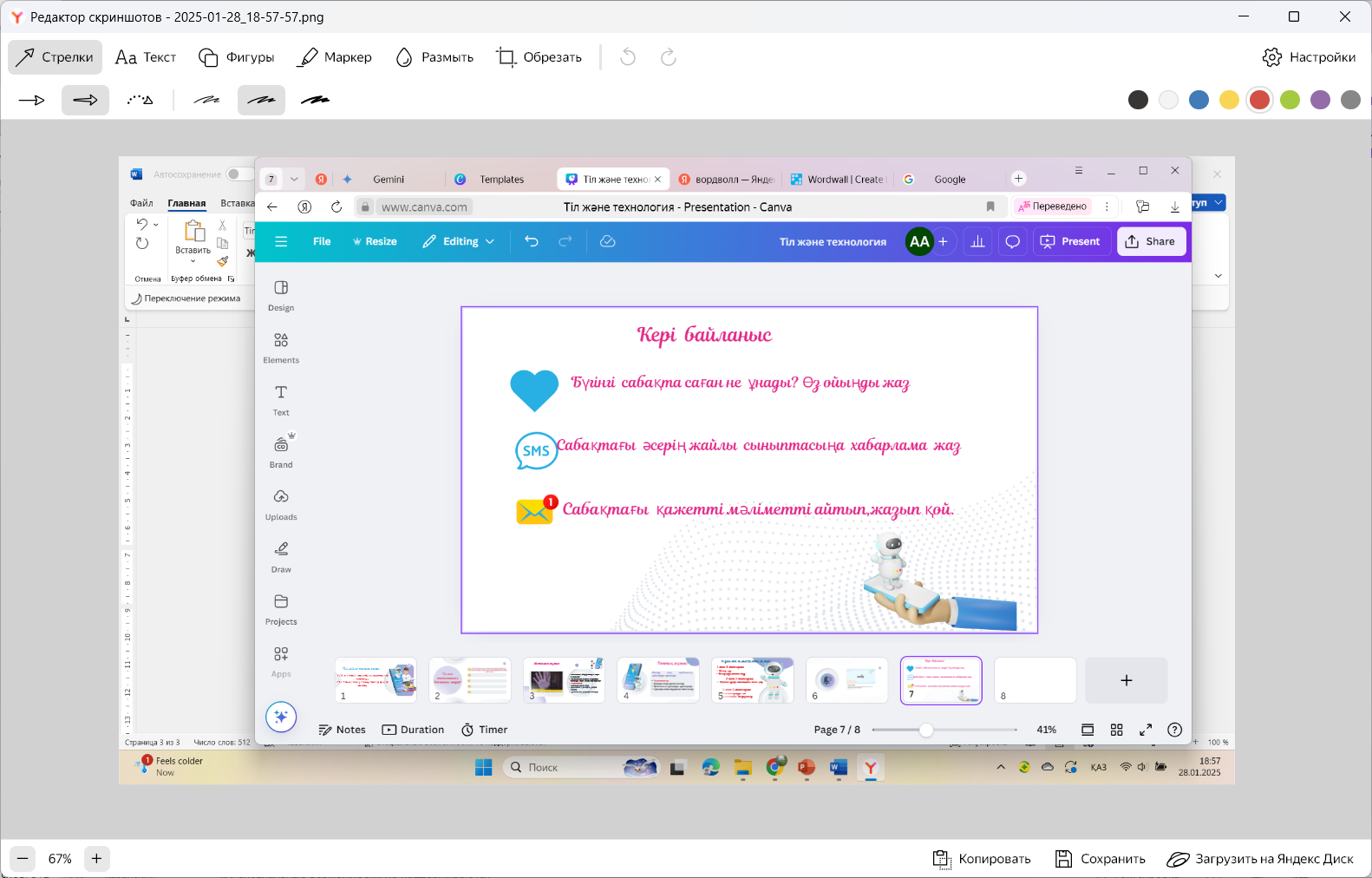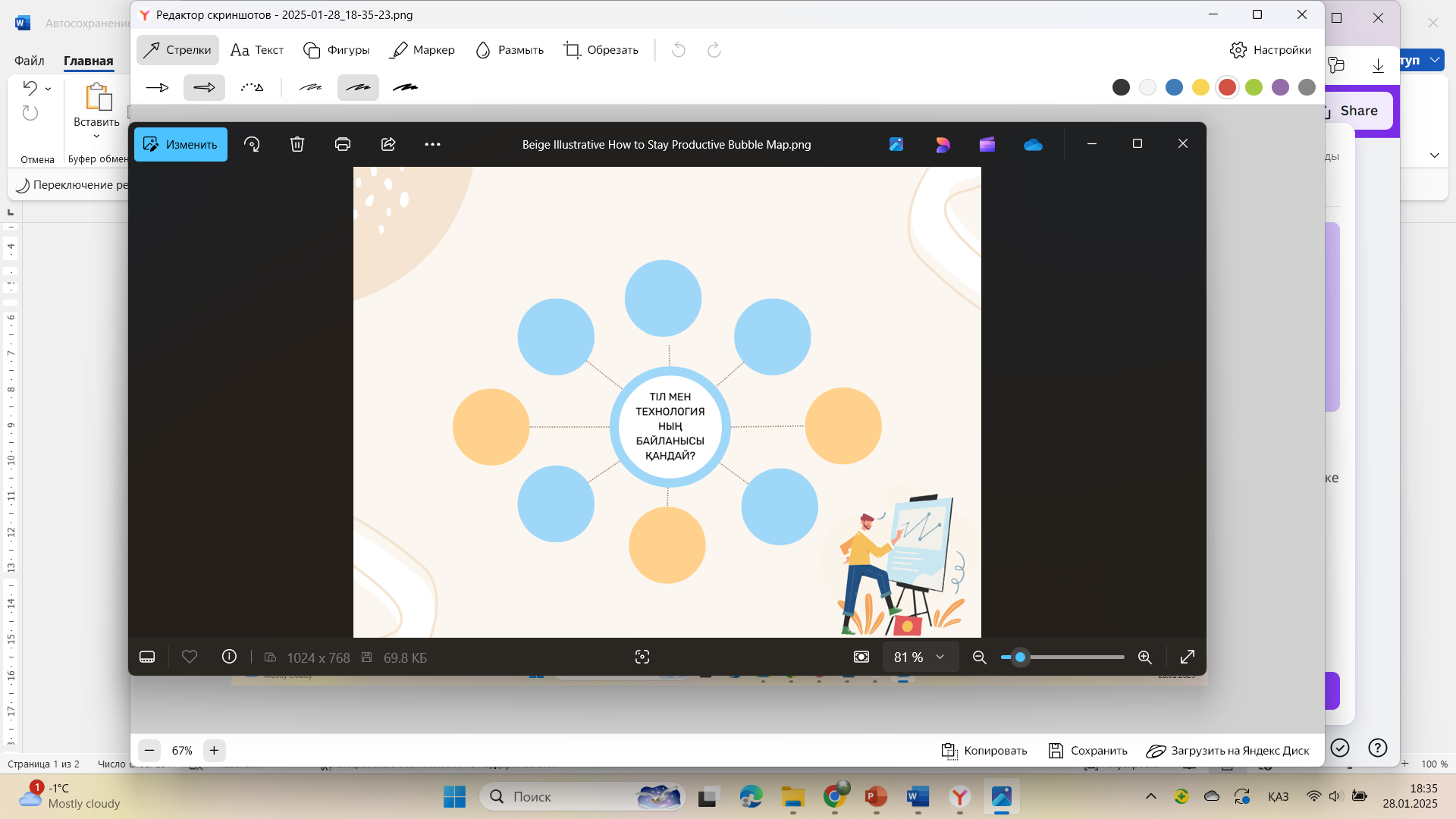 Мағынаны тану. Тыңдалым тапсырмасы Интерактив тақтада «Тіл мен технология» бейнесін көрсету. Оқушыларға сұрақ қою: Технологияның тілді дамытуға қандай ықпалы бар? Егер технология болмаса, ақпаратты таратуда қандай қиындықтар туар еді? Дескрипторлар: Бейнемазмұнды түсінеді. Проблемалық сұрақтарға өз пікірін білдіреді. Өз ойын нақты әрі орынды жеткізеді. Топтық жұмыс: Тапсырма:Мәтінді оқып, проблемалық сұрақтарды құрастырады 1-топқа мәтін: Тақырыбы: Тіл мен әлеуметтік желілер Қазіргі уақытта әлеуметтік желілер тілдің дамуына айтарлықтай әсер етуде. Әсіресе, жастар арасында қысқартылған сөздер, интернет-слэнгтер, эмодзилер қарым-қатынастың жаңа түрін қалыптастырып отыр. Бұл үрдіс қарым-қатынас жасауға қолайлы болғанымен, тіл мәдениетін сақтауда қиындық туғызуы мүмкін. Сонымен қатар, желідегі сауатсыз жазбалар жазу стиліне әсер етіп, грамматикалық қателердің артуына ықпал етуде. Проблемалық сұрақтар: 1. Әлеуметтік желілердің тіл мәдениетіне ықпалы қандай? 2. Интернет-слэнг пен қысқартулардың тілді қолдануға оң және теріс жақтары қандай? 3. Әлеуметтік желілердегі сауатсыздықтың грамматикалық нормаларға әсері бар ма? 2-топқа мәтін: Тақырыбы: Жасанды интеллект және тіл Жасанды интеллект (ЖИ) тіл үйрену, аударма жасау және мәтіндерді өңдеу салаларында кеңінен қолданылады. ЖИ-дің көмегімен автоматтандырылған аудармалар мен дауыстық тану қызметтері жүзеге асуда. Бірақ, ЖИ-дің тілдік нюанстарды, ұлттық мәдениетке тән ерекшеліктерді жеткізе алмауы оны толықтай сенімді құралға айналдырмайды. Сонымен қатар, ЖИ-ді қолдану арқылы кейбір мамандықтар (аудармашы, редактор) өз маңыздылығын жоғалтуы мүмкін. Проблемалық сұрақтар: 1. Жасанды интеллект тілдік ерекшеліктерді жеткізуде қандай қиындықтарға тап болады? 2. ЖИ-дің аудармашы және редактор мамандықтарына әсері қандай болуы мүмкін? 3. ЖИ-дің көмегімен тіл үйренудің артықшылықтары мен кемшіліктері қандай? 3-топқа мәтін: Тақырыбы: Технология және ұлттық тілдерді сақтау Технологияның қарқынды дамуы көпұлтты қоғамдарда ұлттық тілдерді сақтау мәселесін алдыңғы орынға шығарды. Бір жағынан, цифрлық платформалар ұлттық тілдерді кеңінен насихаттау үшін мүмкіндік берсе, екінші жағынан, әлемдік тілдердің басымдылығы ұсақ тілдердің қолданысын азайтуда. Мысалы, технологиялық құралдардың көбі ағылшын тілінде қолжетімді, ал кейбір ұлттық тілдер цифрлық кеңістікте мүлдем көрінбейді. Проблемалық сұрақтар: 1. Технология ұлттық тілдерді сақтап қалуда қалай көмектесе алады? 2. Цифрлық платформалар ұсақ тілдердің жойылуына ықпал ете ме? 3. Ұлттық тілдерді технология арқылы насихаттау үшін қандай шаралар қолдану керек? Дескрипторлар: