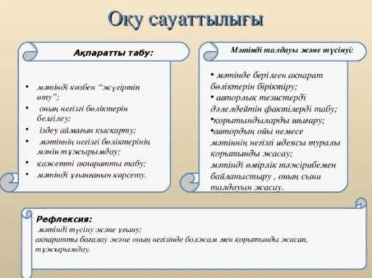 Оқушыларға оқу сауаттылығын арттыруда қажетті ақпаратты іздеу және таңдау, әдістерді қолдану, ақпаратты іздеу, оның ішінде компьютерлік құралдарды пайдалану, сөйлеуді саналы және ерікті түрде құрастыру сияқты бағыттарымен таныстыру.