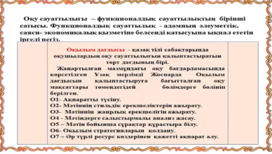Оқушыларға оқу сауаттылығы дегеніміз мемлекеттік білім стандартына сәйкес жоспарланған оқыту нәтижелерінің бірі болып табылатындығын түсіндіру.
