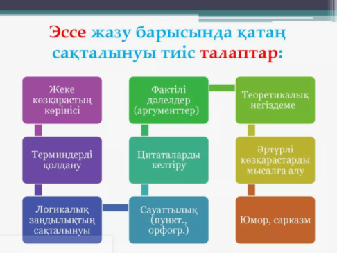 Оқушыларға мәтіннен алған ақпаратты қорыту үшін «эссе» әдісі туралы түсіндіру, эссе жазу барысында оқушылар мәтіндегі негізгі ойды, идеяны анықтау қажеттігін ұғындыру.