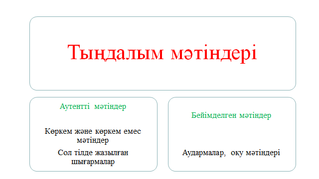 • Тыңдаушыға тек мәтінді ғана тыңдауға емес, оны түсінуге және анықтауға да мүмкіндік беру. Мысалы, мәтінді тыңдап, қандай жағдайларда белгілі бір сөздер қолданылады, соны анықтау.