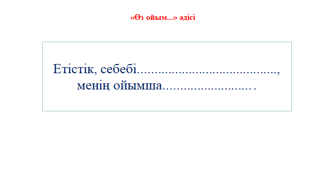 Әдіс бойынша оқушыларға тыңдалым мәтіні қойылады. Тыңдалым мәтінін тыңдағаннан кейін оқушылар арнайы формулаға салып, өз ойын айтады.